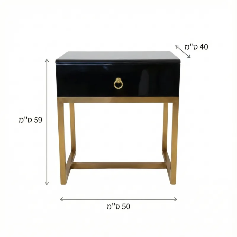 שידת לילה מעוצבת בסגנון מודרני ויוקרתי, עשויה נירוסטה בצבע זהב בשילוב עץ בצביעה אפוקסית .