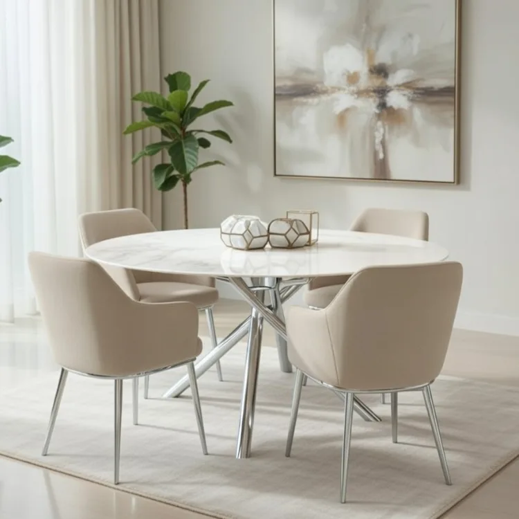 שולחן אוכל עגול נפתח דגם טוסון כסוף דמוי שיש לבן מבריק