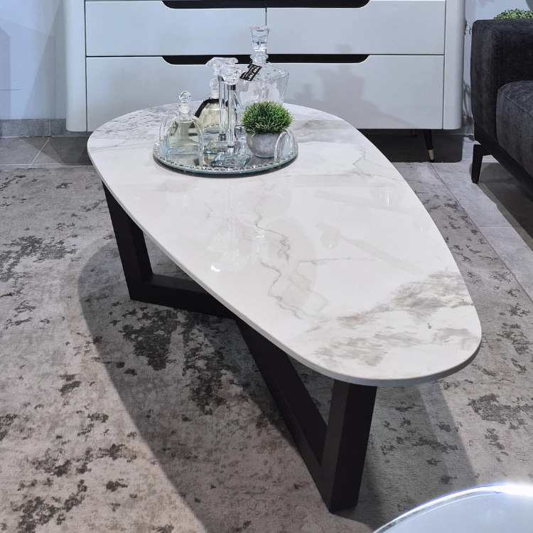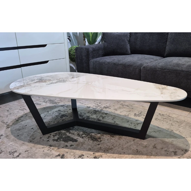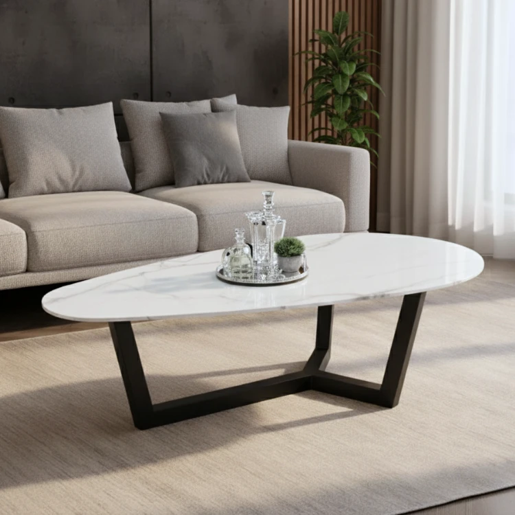 שולחן סלון אליפסה אבן צפחה דמוי שיש טבעי בעיצוב איטלקי מודרני.