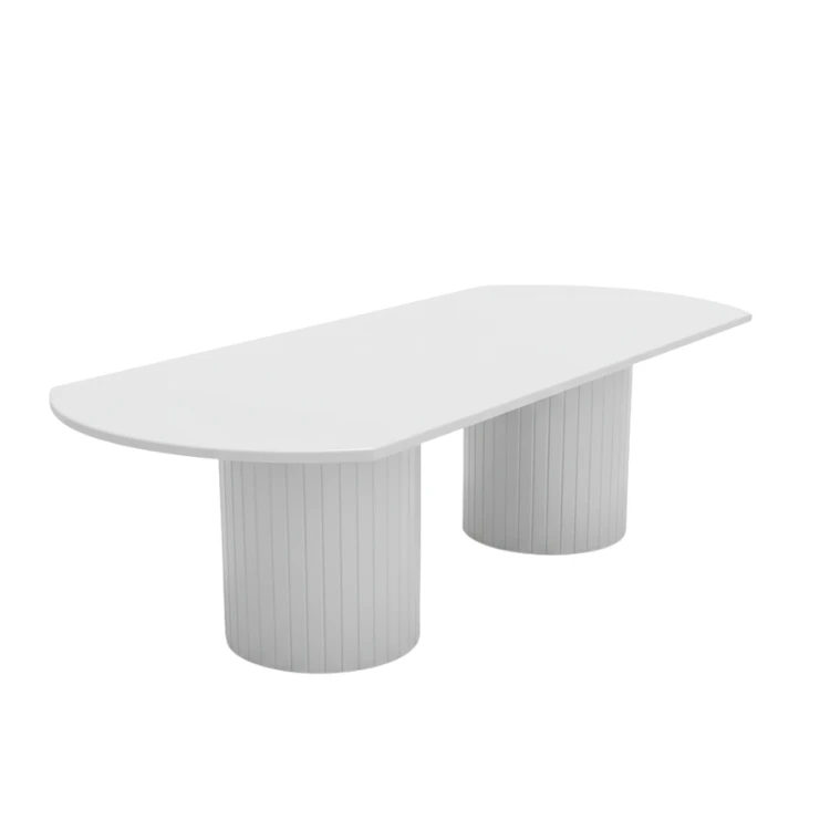 פלטת השולחן בעיצוב אליפטי רך, בגוון לבן חלק ונקי, ניצבת על שני בסיסי מחורצים בעיצוב עדין ומודרני .