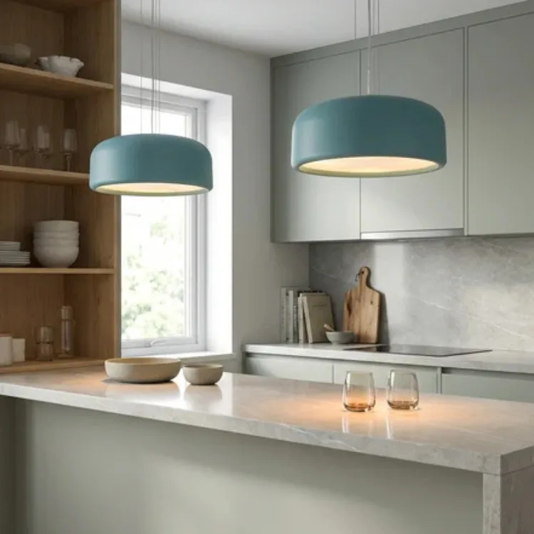 גוף תאורה תלוי דגם נועם בעיצוב מינימליסטי מודרני, המשלב בין צורות רכות לצבעוניות חמימה ומאוזנת: גוון קפה נטרלי, ירוק מרגיע וכחול מעודן – להרמוניה מושלמת בכל חלל.