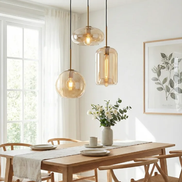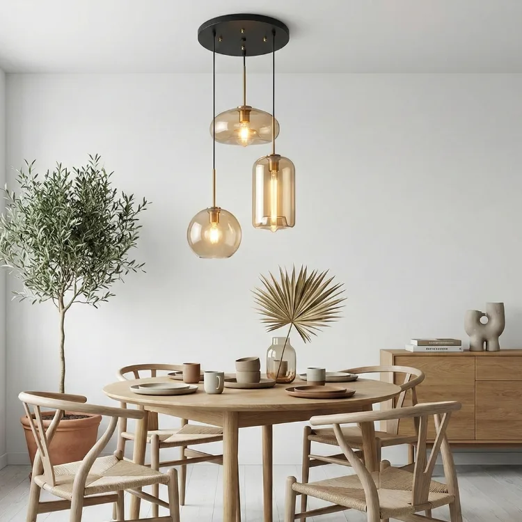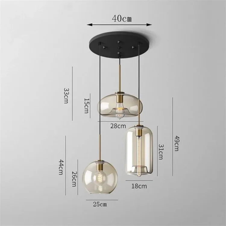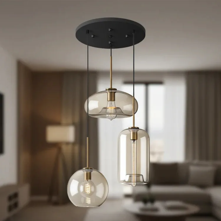 שלישיית אהילים מזכוכית בעיצובים שונים משתלבים יחד על גבי בסיס עגול שחור, בתלייה מדורגת בגבהים שונים – ליצירת תנועה, עניין ואיזון חזותי מושלם.