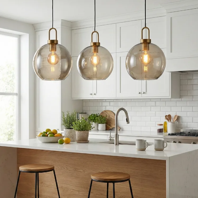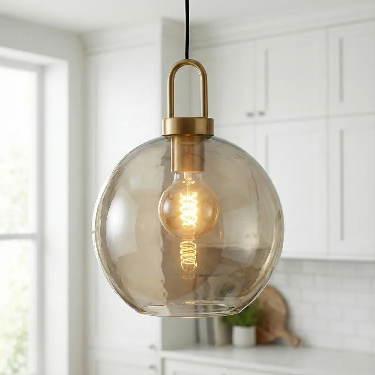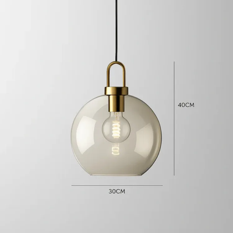 גוף הזכוכית המעוגל משדר רכות אורית ונוכחות מעוצבת, כשהשילוב עם ראש תלייה בגוון פליז מעניק טון קלאסי-יוקרתי.