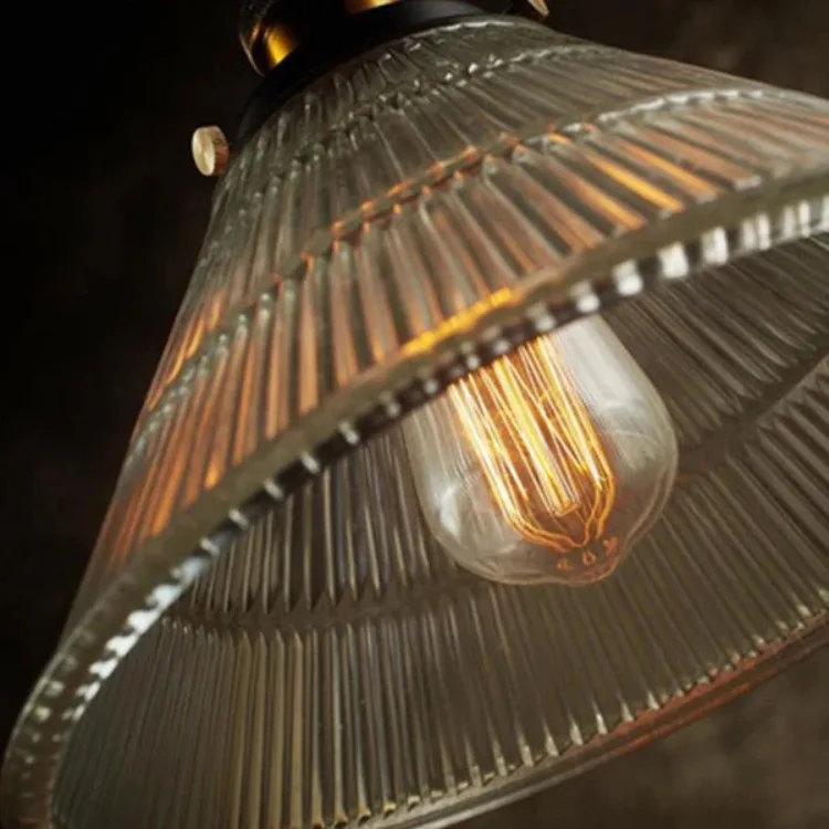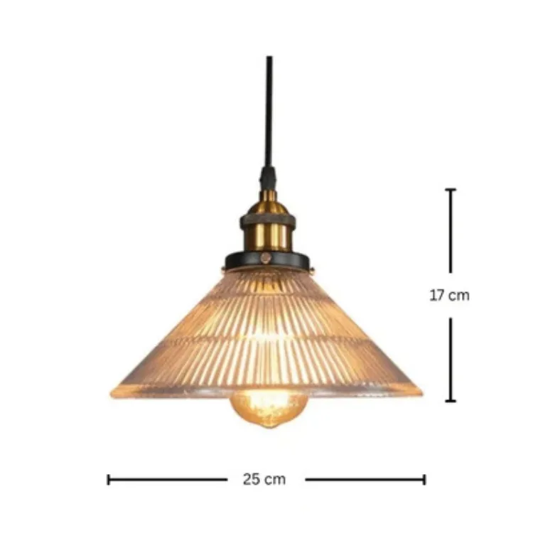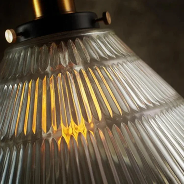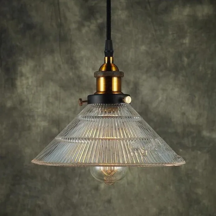 אהיל זכוכית חרוטי שקוף, המחובר לראש פליז כהה, מעניק מראה תעשייתי עם קריצה לסגנון הרטרו.