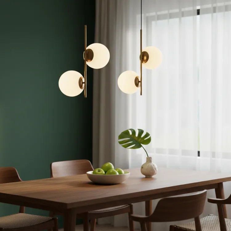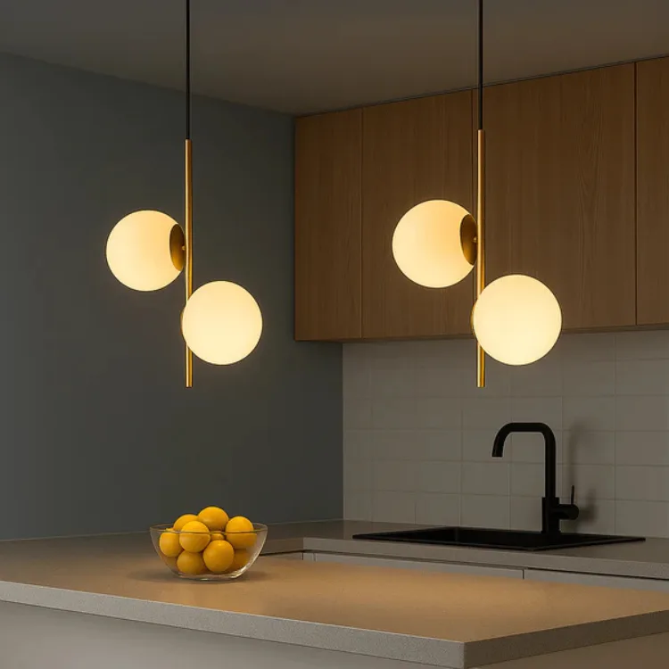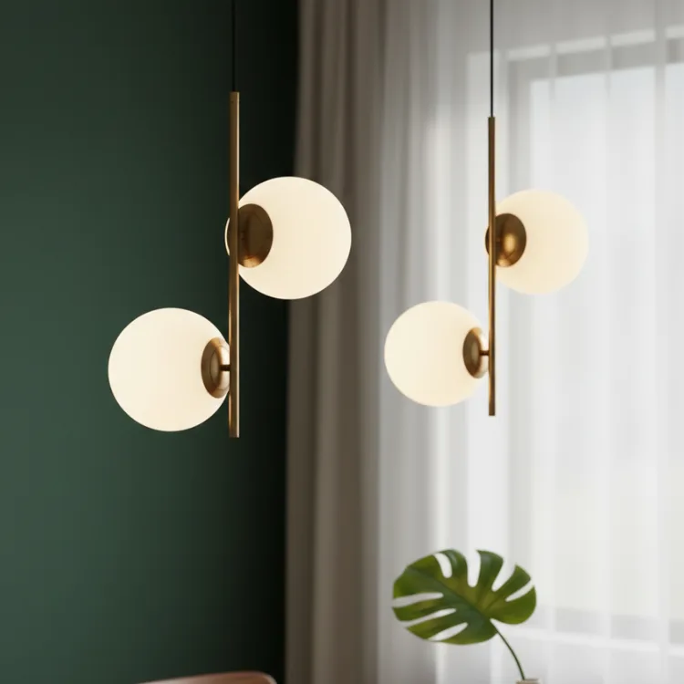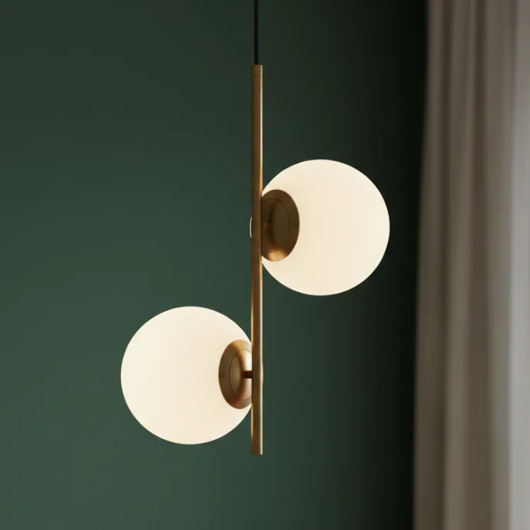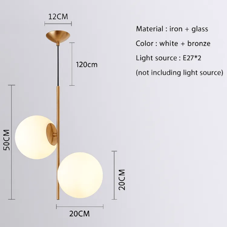 חומרים: זוג כדורי זכוכית חלבית וגוף מתכתי בגימור פליז מט איכותי.