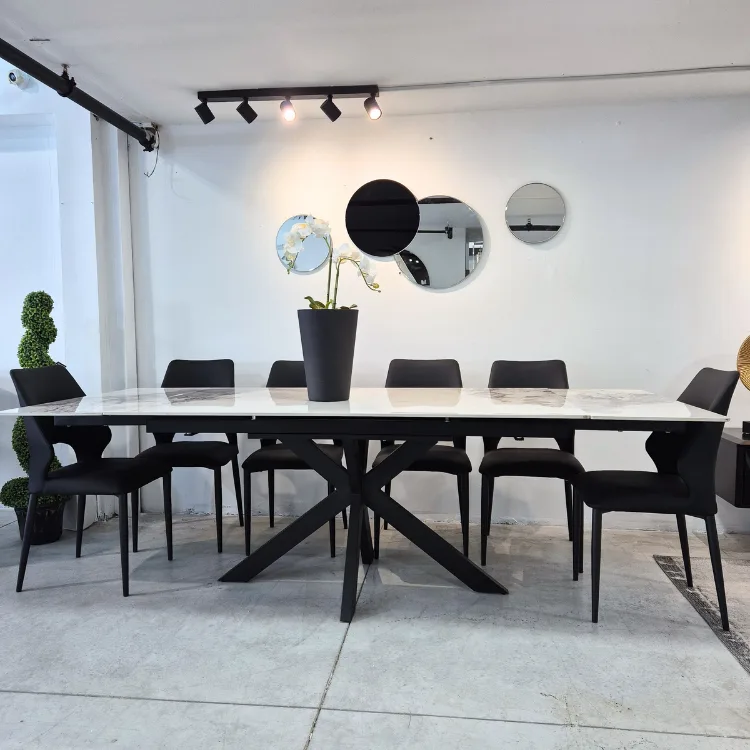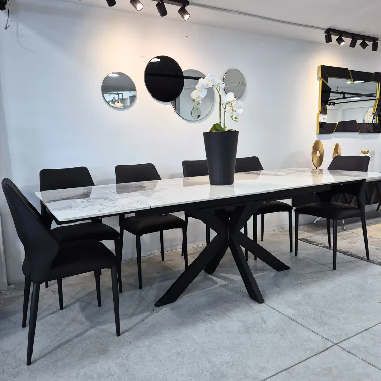 שולחן אוכל נפתח אבן דמוי צפחה דגם לג'נד שחור לבן